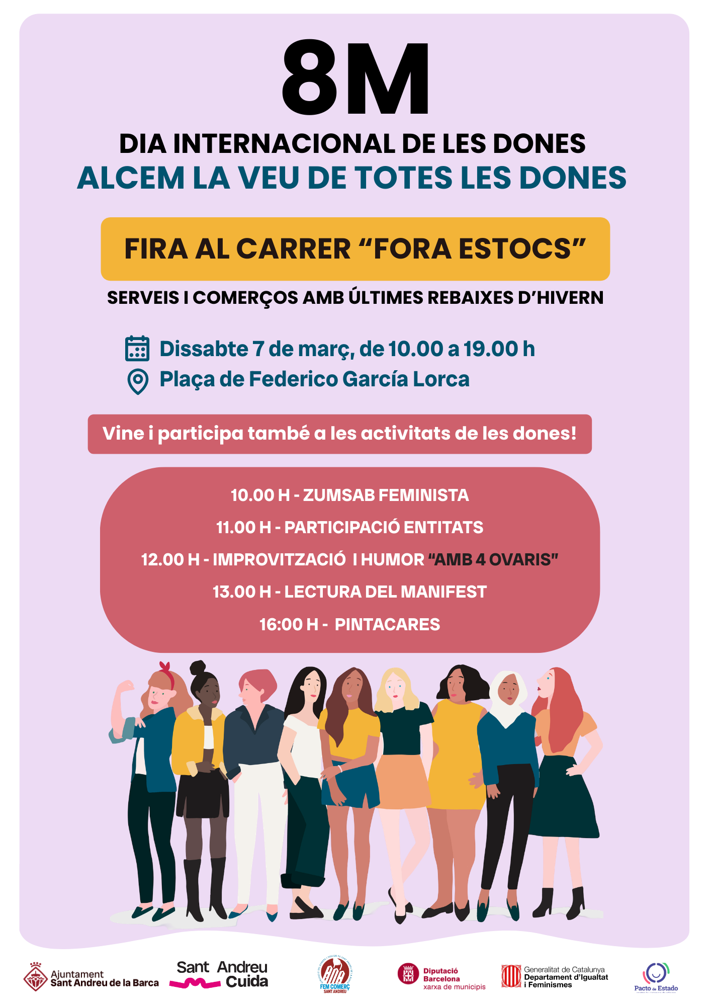Aquest dissabte 7 de març a les 10.00 h, la plaça Federico García Lorca es convertirà en l’escenari d’una jornada plena d’energia, reivindicació i comunitat amb la celebració del ZUMSAB FEMINISTA.